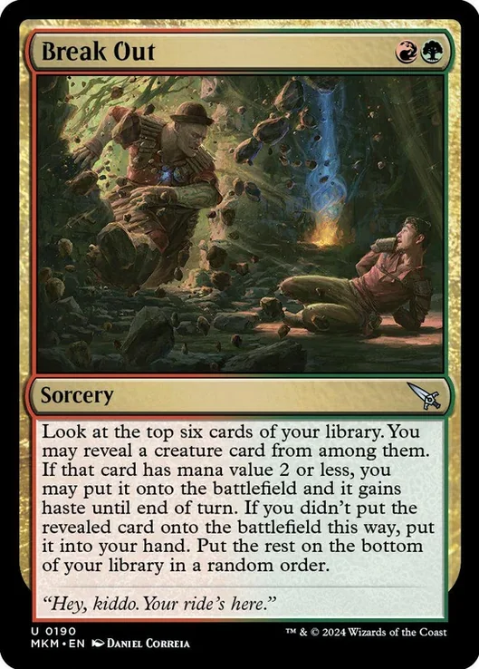 Break Out acts almost like a mini Collected Company, allowing you to look at the top 6 cards of your deck and select a creature card from among them. If that creature has a CMC 2 or less you may put it into play with haste, otherwise you put it into your hand.